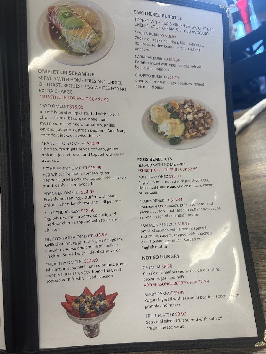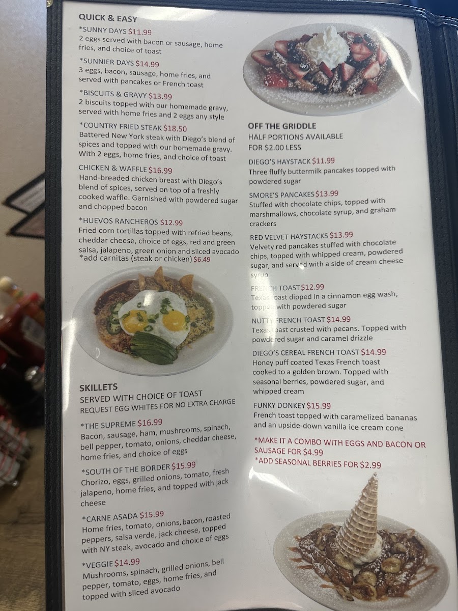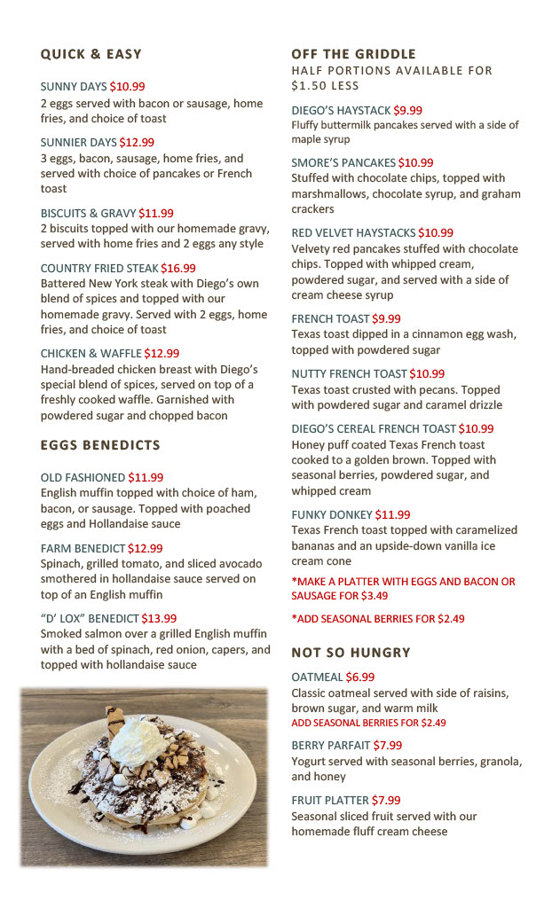 Whether you’re stopping by for a relaxed morning meal or a laid-back brunch, the menu has something to suit the moment. From plates like Country Fried Steak and the indulgent Diego’s Cereal French Toast to fresh options such as the Omelette loaded with spinach, mushrooms, red bell peppers, and bacon, each dish invites a slow, enjoyable dining experience. The menu also features satisfying skillets and creative specials like Divorced Steak Chilaquiles, perfectly suited for those looking to linger over a flavorful midday meal.