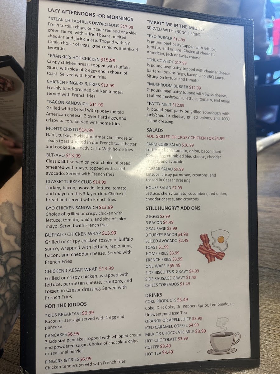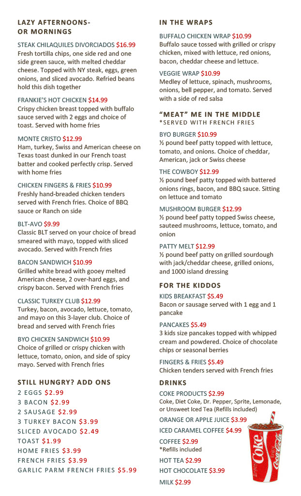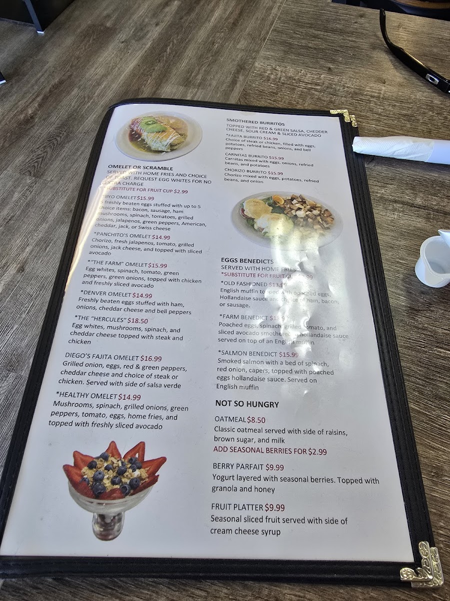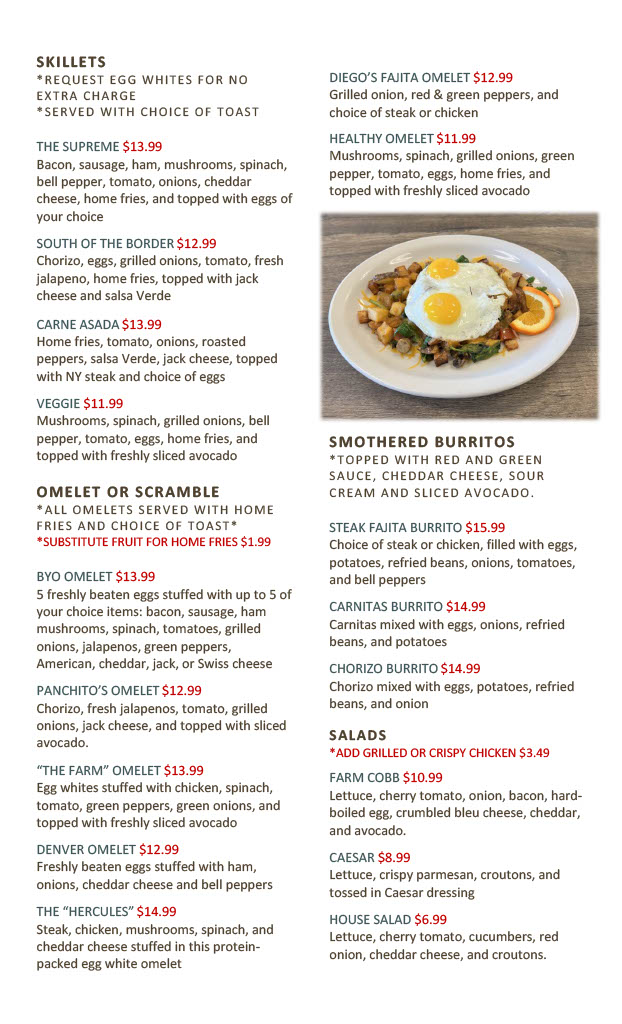 Whether you’re stopping by for a relaxed morning meal or a laid-back brunch, the menu has something to suit the moment. From plates like Country Fried Steak and the indulgent Diego’s Cereal French Toast to fresh options such as the Omelette loaded with spinach, mushrooms, red bell peppers, and bacon, each dish invites a slow, enjoyable dining experience. The menu also features satisfying skillets and creative specials like Divorced Steak Chilaquiles, perfectly suited for those looking to linger over a flavorful midday meal.
